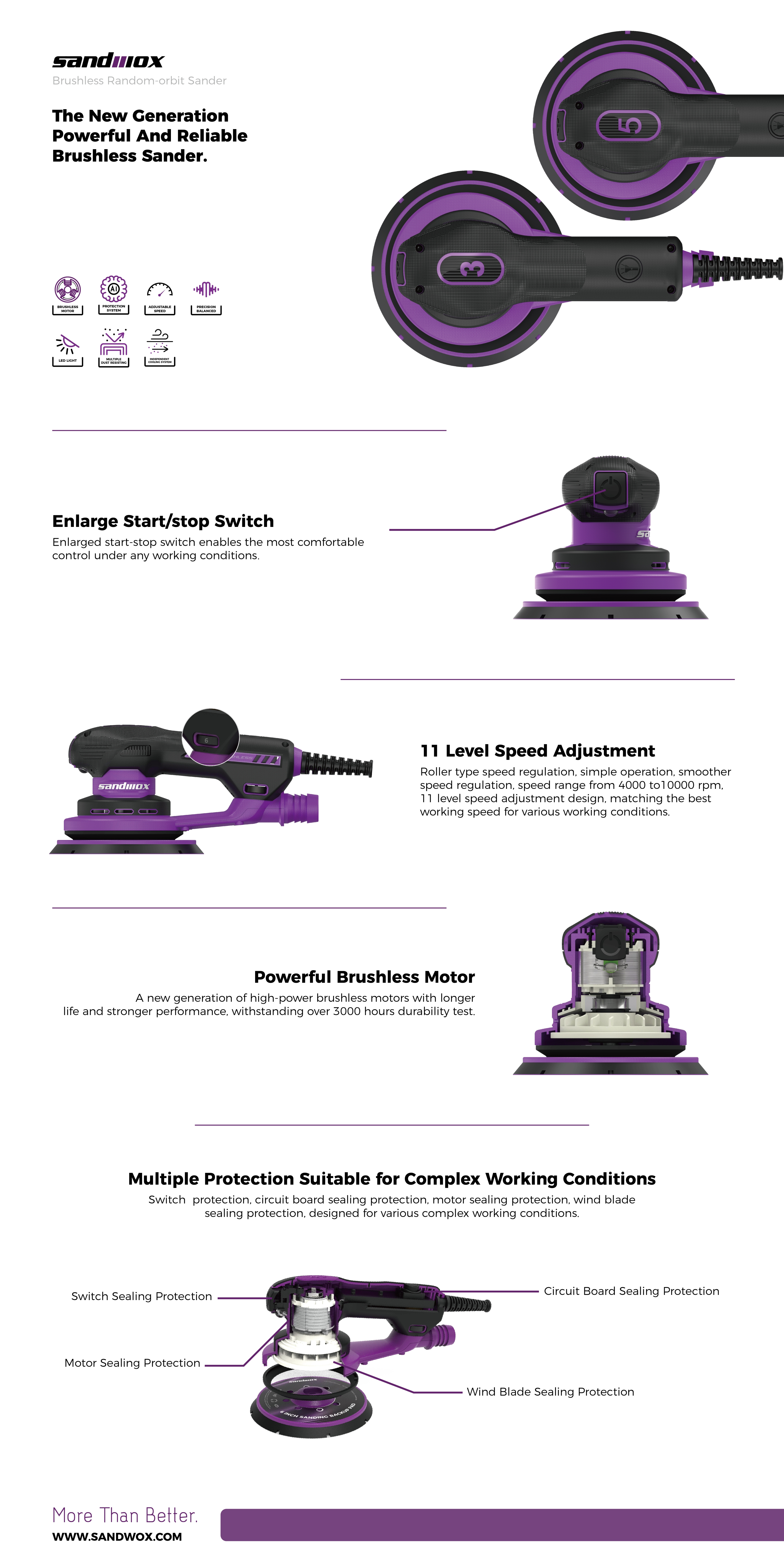 Sandwox SX655 Random-orbit Electric Sander is built for easy sanding with one hand, a combination of compact size and ergonomic comfort. A 400W brushless motor delivers consistent power at speeds from 4,000 to 10,000 RPM. This motor requires lower power consumption and generates less heat vs. brushed motors, so it doesn't require added venting and won't accumulate as much dust inside the machine. It is suitable for pre-sanding for polishing to coarse and intermediate sanding on varnish, primer, filler or wood.